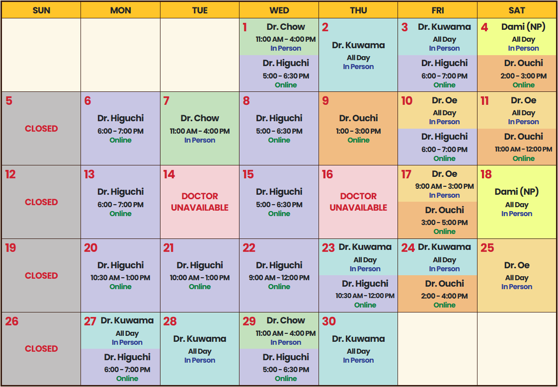 2026年4月の診療スケジュールについて以下のカレンダーをご参照下さい。